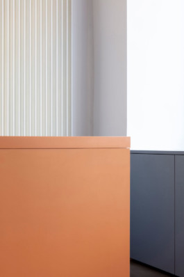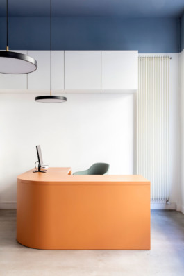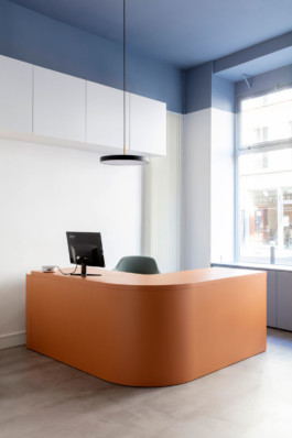 Un ensemble de placards bas ont été réalisés sur mesure en avant, longeant la façade vitrée. L’entrée se faisant sur cour, à l’arrière de la pièce, ce linéaire de rangement permet créer une frontière visuelle entre les bureaux et la rue.