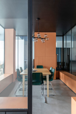 La salle de réunion est le cœur du bureau. Située au milieu de l’espace, elle s’est dessinée autour des contraintes structurelles. Pensée pour pouvoir la contourner complètement, elle dissimule les WC et l’espace imprimerie du fond des bureaux ouverts à l’avant.