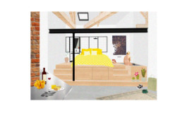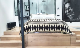 La partie nuit a été surélevée du reste de l’appartement, le lit positionné sur une plateforme surplombant l’espace jour.