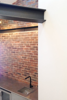 En combinant les deux pièces et en récupérant les combles, le nouvel espace aux grandes hauteurs sous plafond mis à nu a donné lieu à un jeu de différences de niveaux des sols.
