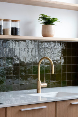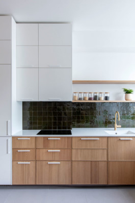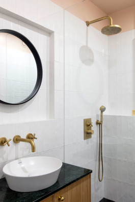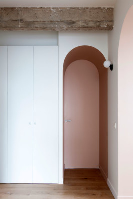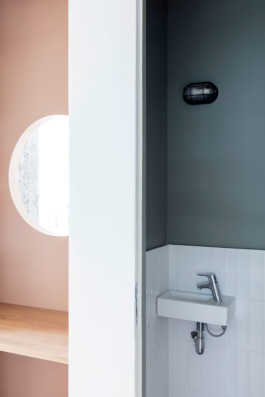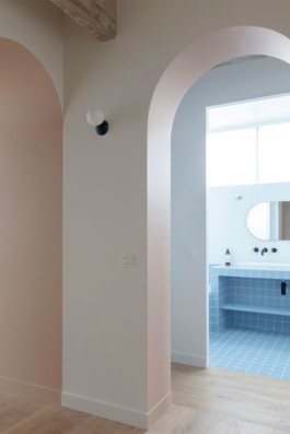 Ce cœur est ponctué par des arches marquant les nouvelles traversées de lumière et indiquant les passages vers d’autres pièces de la maison : la suite parentale avec son dressing et sa salle d’eau, isolée des deux chambres d’enfants ; un WC séparé est caché dans une épaisseur, une buanderie, une pièce de vie servant à la fois de séjour et de salle à manger, au coin opposé de la cuisine, et une salle de bain à côté des chambres d’enfants.
