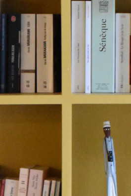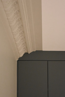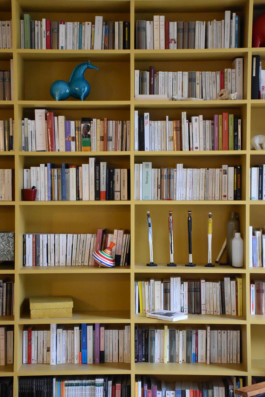The bright functional entrance serves each of the main rooms of the apartment. The moldings, glass doors and woodwork have all been preserved, while modern carpentry elements have been added, such as the large living room library.