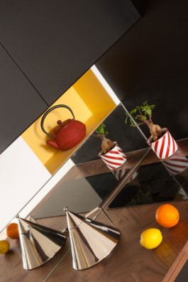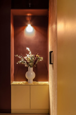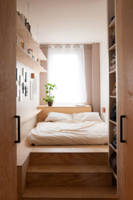 The kitchen and the restrooms are discreetly tucked away in the bottom of the apartment. The bedroom is kept separate and secluded. A custom wood bed platform floats in the centre of the room creating a sense of well-being and containment within the open space.