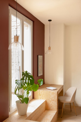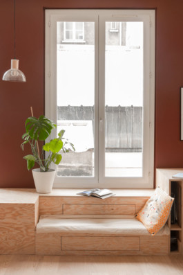 The custom designed furniture located below the windows acts as a platform, sitting area, stairs leading to the terrace, storage and office space. We created a closed-off, cold-block entrance area with a bench, where students can take off their shoes.