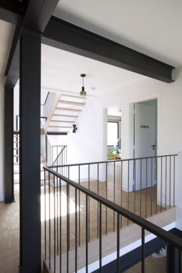 On the upper level, we were able to keep three bedrooms in the original layout. We relocated a bathroom to make room for a double high space in the dining room below.