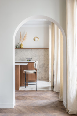 Constrained by the lintels of the fireplaces, two asymmetrical arches were made to connect the kitchen to the dining room.