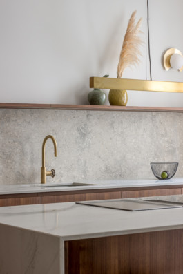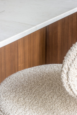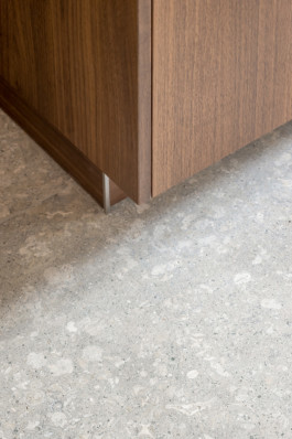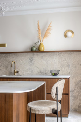 The central island with multiple uses is positioned at the junction of two floors: the parquet floor of the apartment and the stone floor of the kitchen.