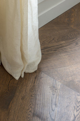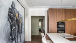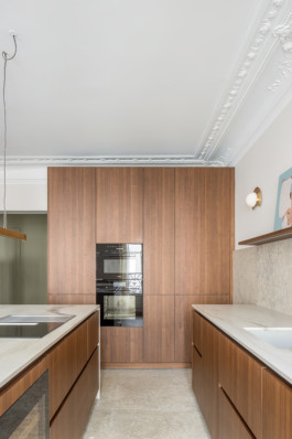 Taking advantage of the high ceilings, the choice of the floor fell on a darker parquet reminiscent of the walnut of all the joinery of the apartment.