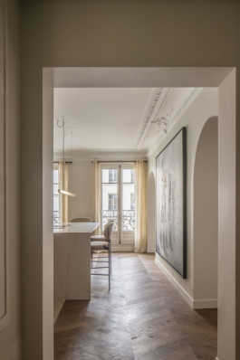 Located on the second floor of a typical Haussmannian building on rue des Martyrs, the apartment has been completely transformed for its new owners with the idea to locate all the living area in the adjoining spaces street side. The kitchen, dining room and living room are connected, and open onto a long balcony.