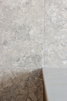 The master suite is accessible from the living room via the dressing room. On the courtyard, it is a space with soft colors. The bathroom is completely open to the bedroom via this large glass roof, access to which is a glass door that pivots on its central axis. The shower is a niche apart, with the subdued and indirect light of its false ceiling.