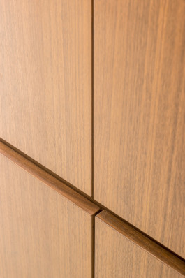 The joinery was made to measure in walnut. The entrance wall hides the WC and two cupboards.