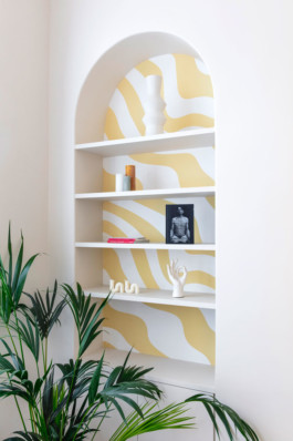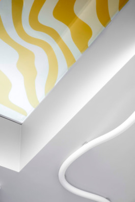 The curved and generous shape brings comfort and alludes to the accompaniment between the doctor and his patient. Low ceiling height, curves, soft materials and peaceful colors, textiles and indirect natural light are all elements that want to relax and reassure the patient. The armchair is centered in the room, and overlooks under a glass roof letting in natural light and the view of the ceiling of the space or the hypnotizing patterns of the Studio inscribed on the ceiling.