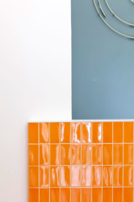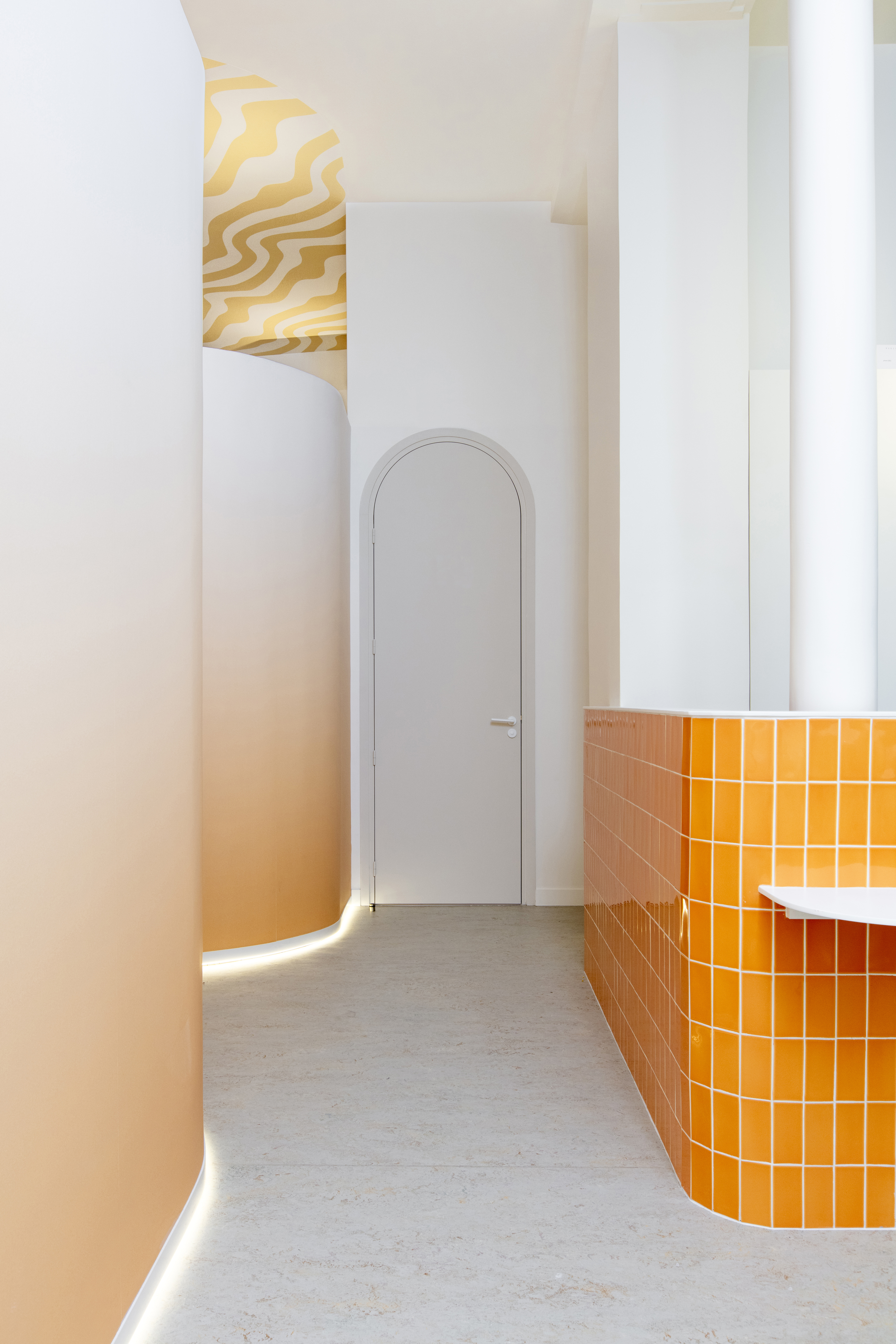 Passing the entrance, a large glass door, the patient faces the reception area at the end of a corridor decorated in gradient orange colors created by the two peripheral spaces - the treatment rooms.