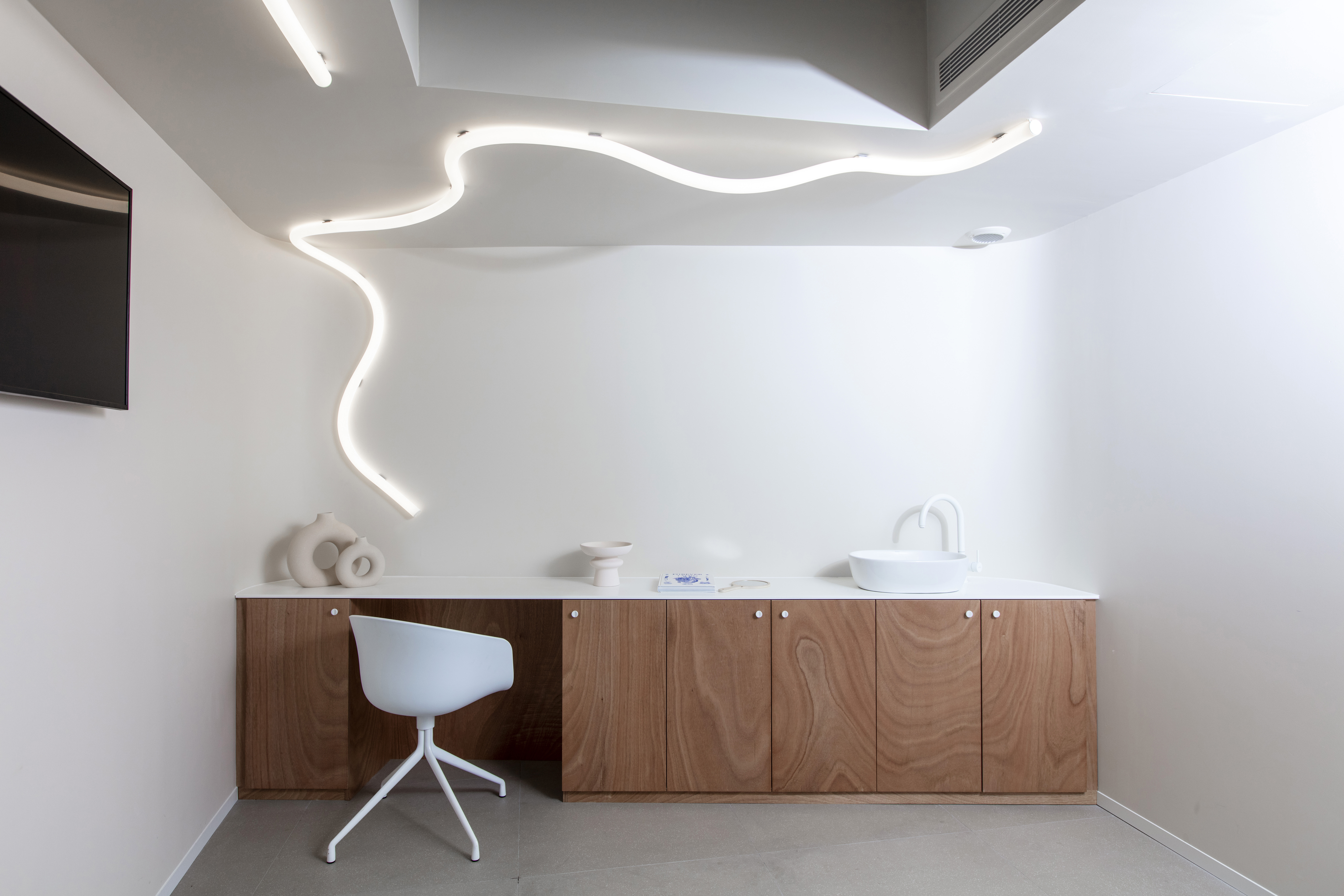 When treatment begins, the patient is taken into one of the rooms - a couple of airtight boxes placed on the edges of the open space - covered with a color gradient wallpaper symbolizing the gradual disappearance of the tattoo. They were designed with the idea of becoming a cocoon for the patient, entirely isolated.