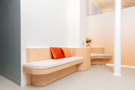 The patient is then directed to the waiting lounge located behind one of the two boxes, in a quiet and isolated spot. The waiting lounge is composed of a long custom-designed bench made of wood and fabric, which envelops the existing structure of the space.